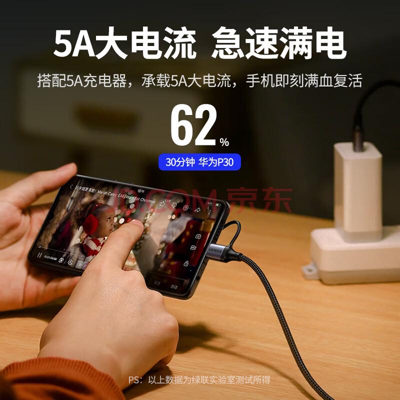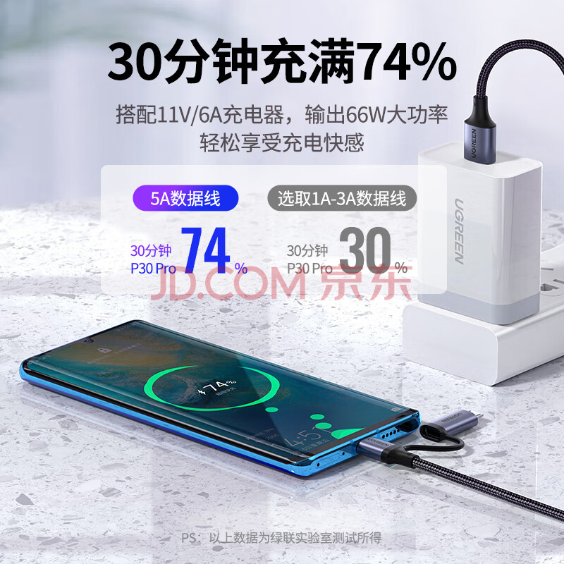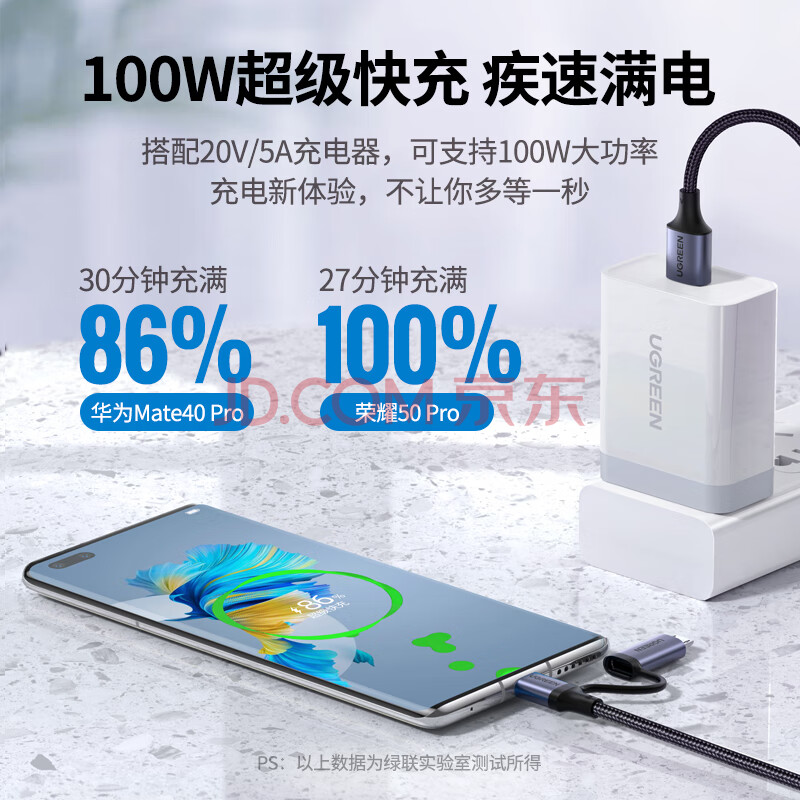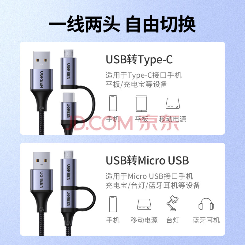 商品相册:绿联Type-C数据线MicroUSB二合一适用华为荣耀超级快充100W/66W充电线6A小米安卓手机Pura80/70/Mate70第