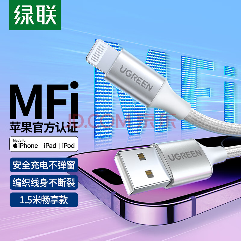 商品相册:绿联【MFi认证不弹窗】适用苹果充电线快充数据线USB to Lightning iPhone14/13/12手机ipad平板1.5m第1张/共8