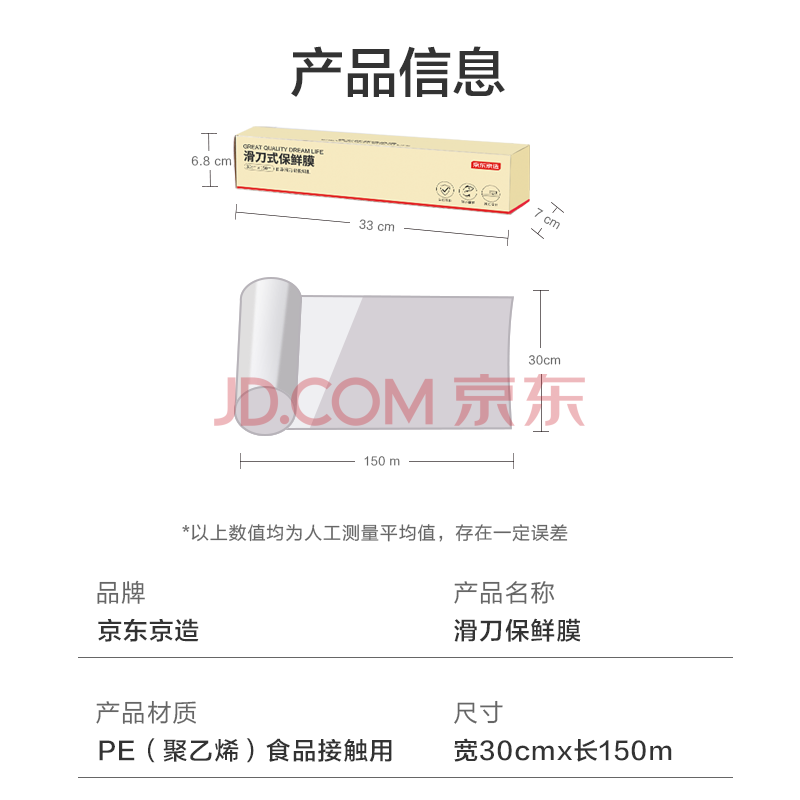 商品相册:京东京造 保鲜膜食品级大号 耐高温滑刀式 送切割器【150米×30cm】第