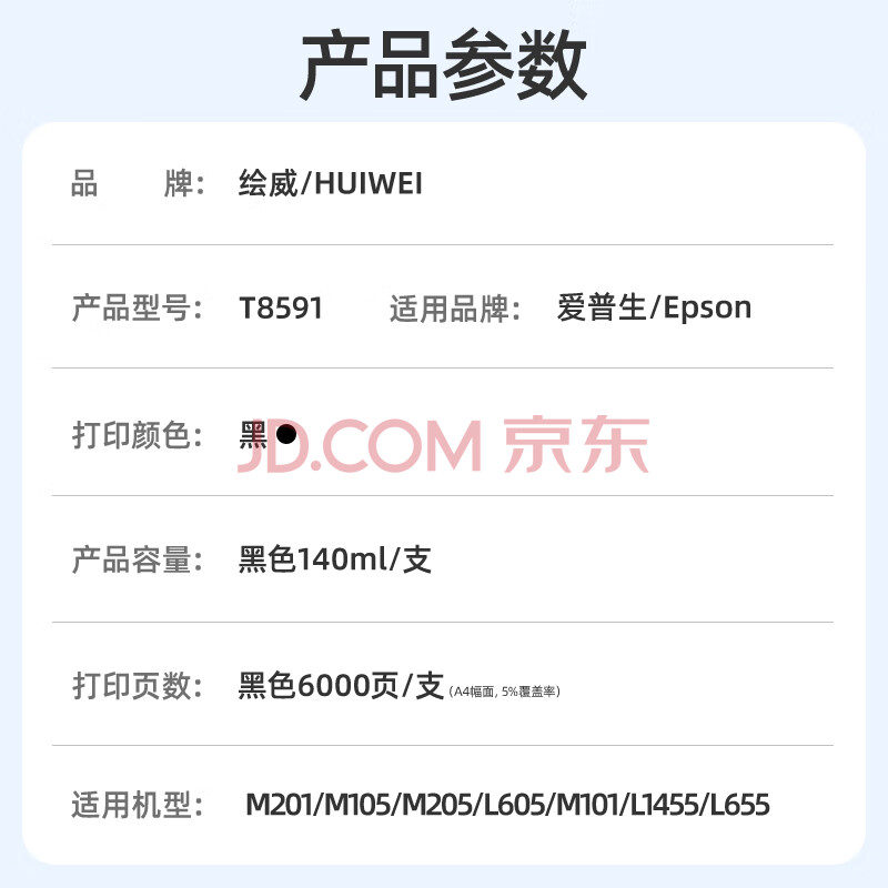 商品相册:绘威859墨水 适用爱普生m105 m101 l1455 m205 l605 l655 m201 epson墨仓式打印机T8591墨水 黑色第