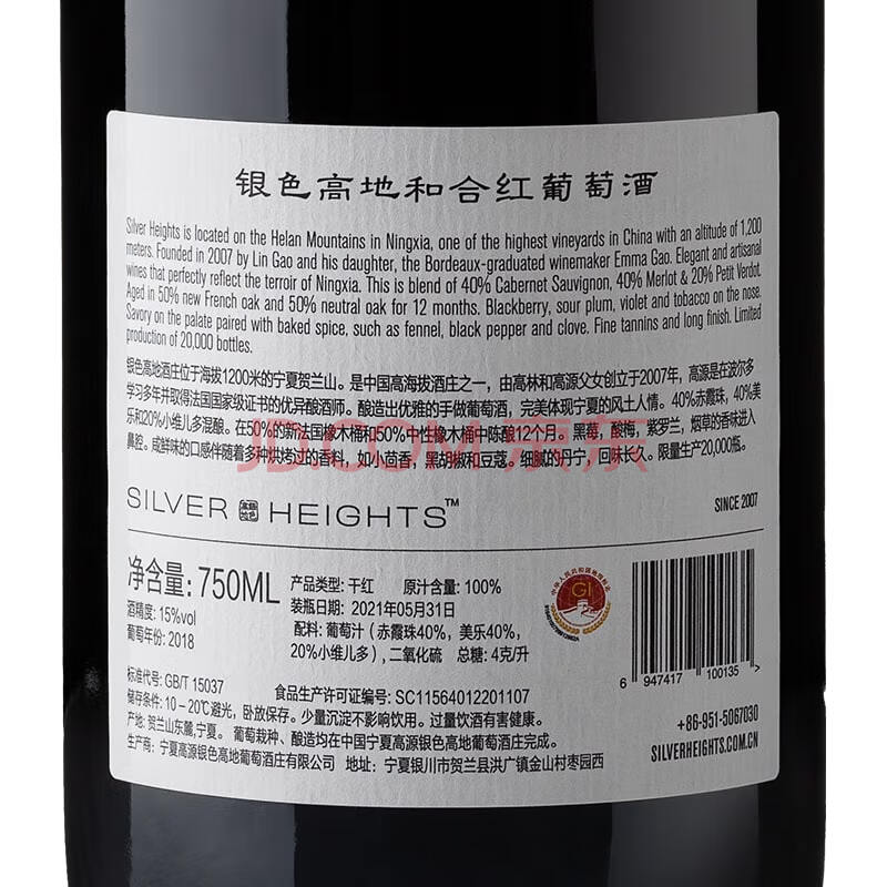 商品相册:银色高地和合红葡萄酒赤霞珠混酿750ML单支装 宁夏红酒第