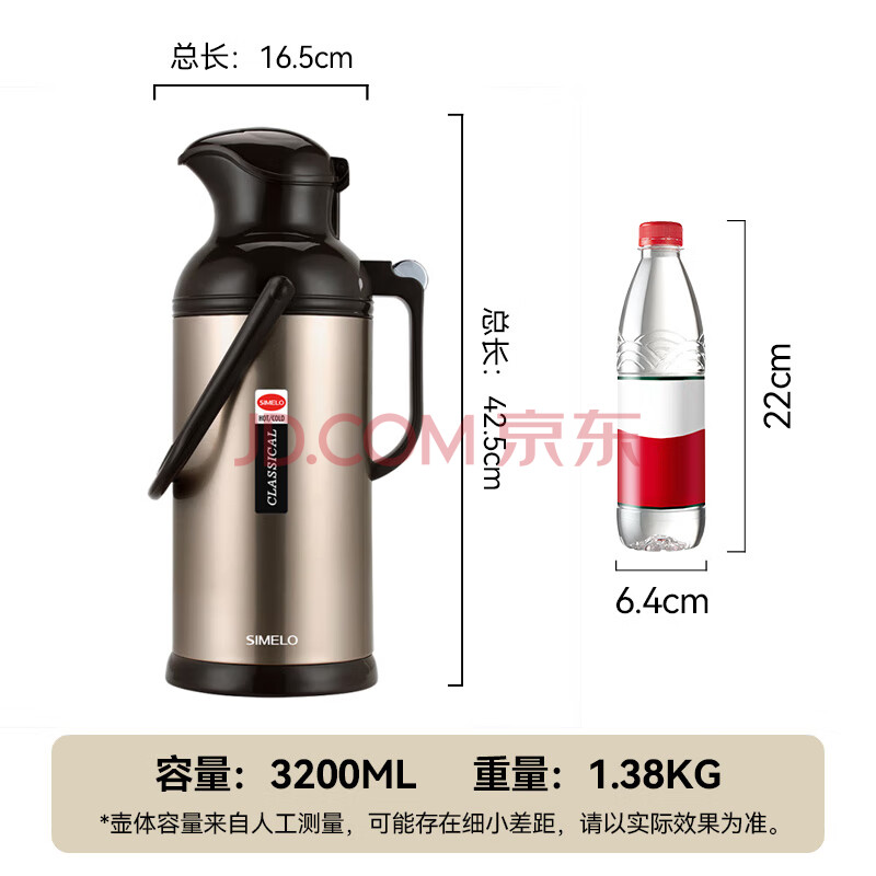 商品相册:SIMELO保温壶玻璃内胆真空热水瓶大容量暖壶保温瓶开水瓶新北京3.2L金色第