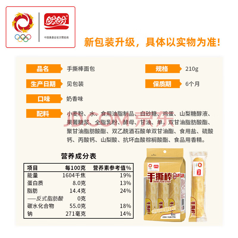 商品相册:盼盼 手撕面包棒 营养早餐食品软面包点心休闲零食小吃 奶香味210g第