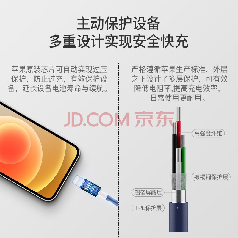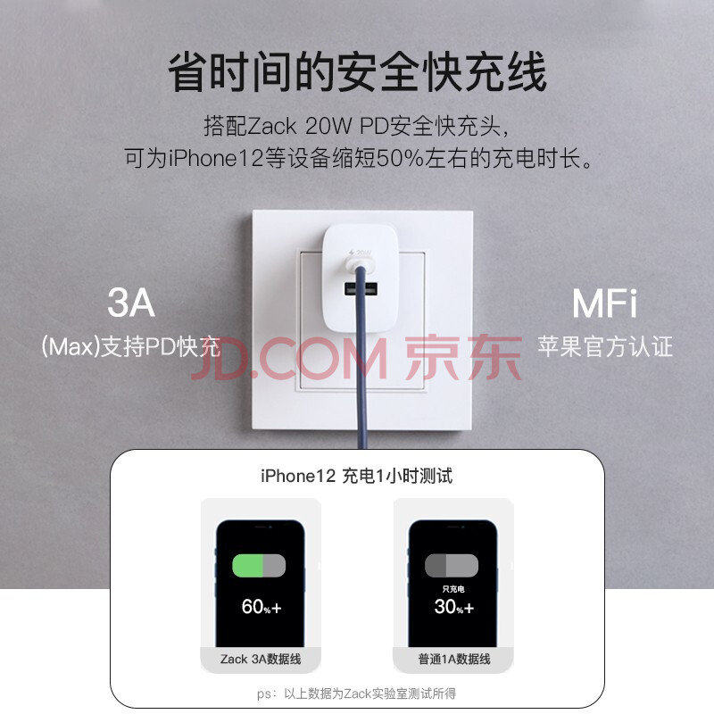商品相册:Zack扎克 苹果MFi认证 Type-C数据线通用iPhone12/11Pro/XSMax/XR/SE2/8p/7手机兼容充电线快充iPad平板 蓝白第