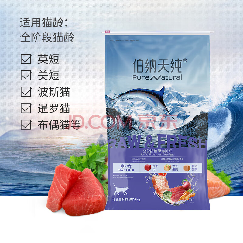 商品相册:伯纳天纯生鲜1.0冻干全价通用猫粮深海御鲜(金枪鱼+鳕鱼+三文鱼)7kg/14斤第