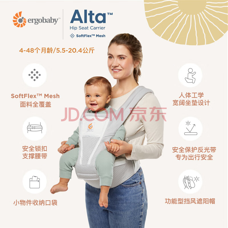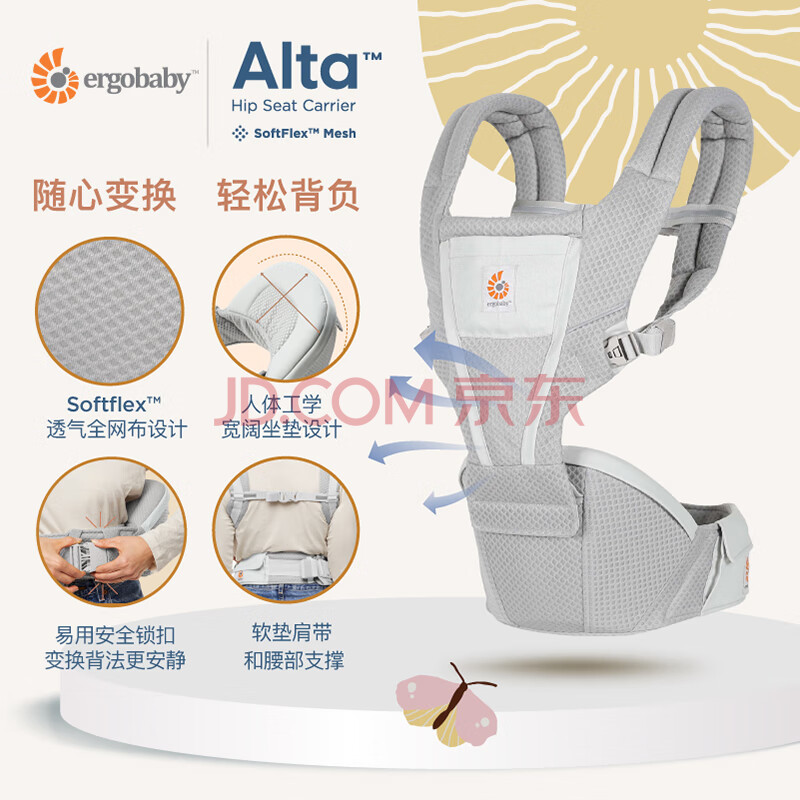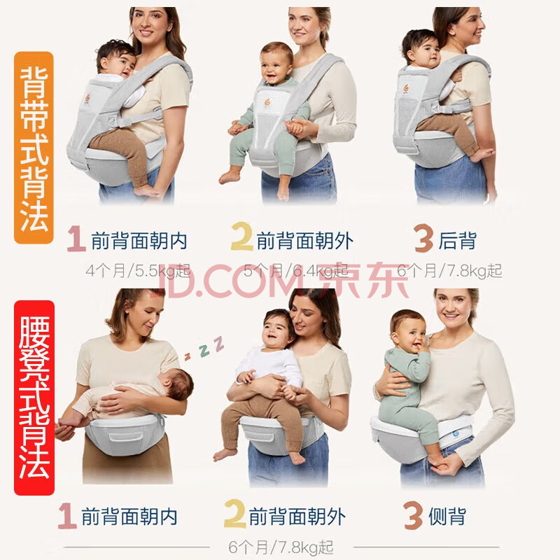 商品相册:ERGObaby美国二狗背带婴儿腰凳Alta全阶段省力通风透气6种背法抱婴凳灰色第