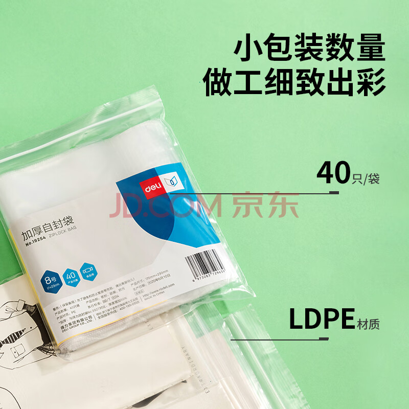 商品相册:得力(deli)食品自封袋8号17*23cm A5纸尺寸防水收纳 40只装(附标签) 19254第1张/共5