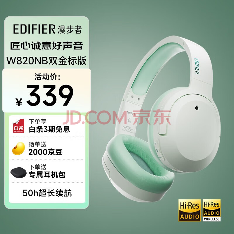 商品相册:漫步者(EDIFIER)W820NB双金标版 头戴式主动降噪蓝牙耳机 手机电脑笔记本耳机 柳芽青第