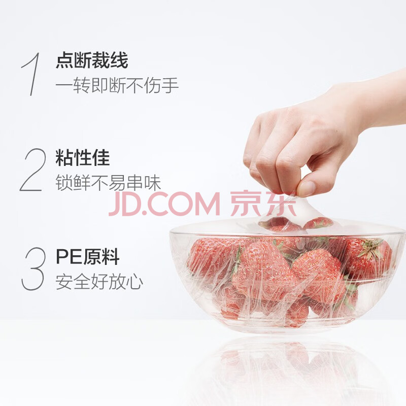 商品相册:妙洁免刀撕保鲜膜点断一次性食品家用大碗PE膜30cm*100m*3卷装【企业专属】第1张/共4