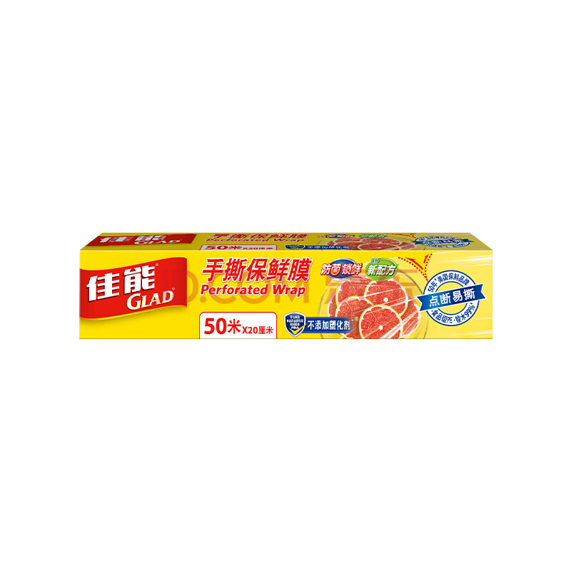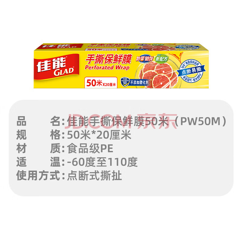 商品相册:佳能(Glad)食品级保鲜膜点断式50米 家用保鲜膜套 20cm保鲜膜小号 PW50M第1张/共9