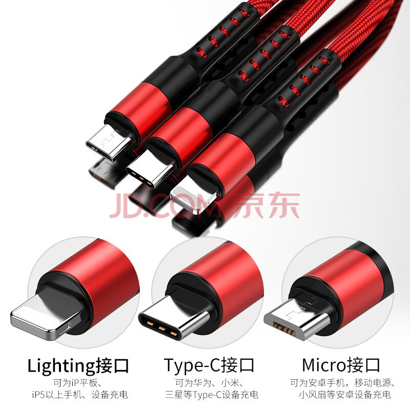 商品相册:OKSJ 数据线三合一充电器线一拖三type-c苹果车载多功能5A快充加长 适用于华为/小米/安卓手机 1.2米第