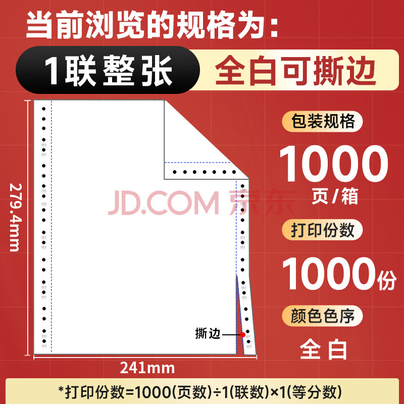 商品相册:天章 (TANGO)【缺页十倍赔】天章风一联整张 针式打印纸 撕边电脑打印纸 出入库送货清单 1000页 241-1S(全白)第