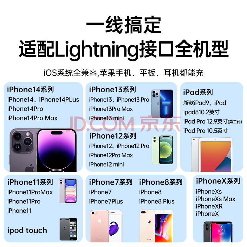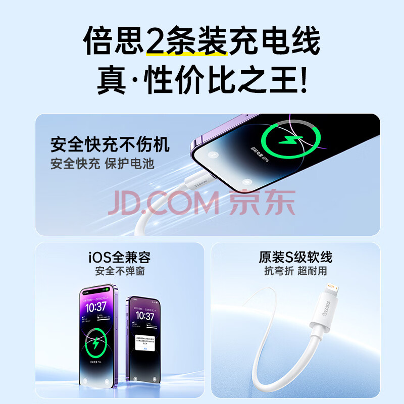 商品相册:倍思苹果快充数据线2.4A充电线适用iPhone14/13/12Pro Max/XR/Xs/11/8手机ipad平板车载1.5米【2条装】第