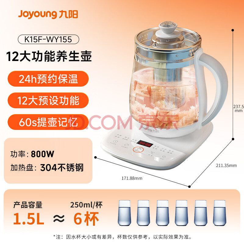 商品相册:九阳(Joyoung)0胶水养生壶玻璃花茶壶可拆卸茶篮 定制12大功能 煮茶器电热烧水壶1.5L WY155第1张/共7