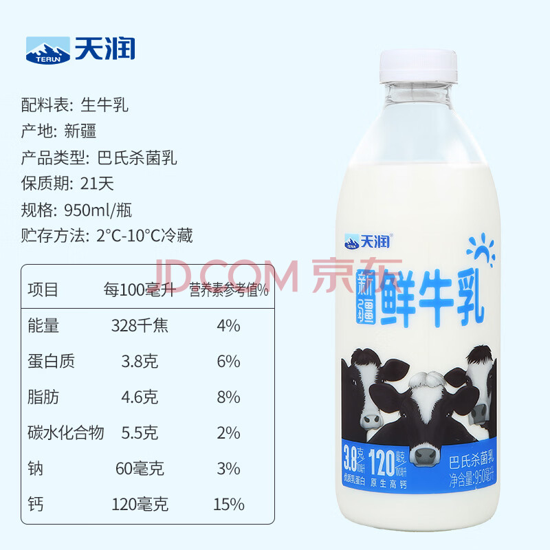 商品相册:天润(TERUN)TERUN 新疆产地 鲜牛乳3.8g巴氏杀菌鲜奶家庭生鲜装950ml*1瓶 第