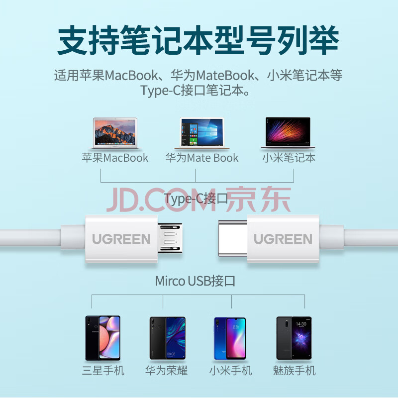 商品相册:绿联 Type-C转MicroUSB公对公2A数据线 接耳机麦克风二合一数据传输充电 适用安卓华为小米手机1.5m第