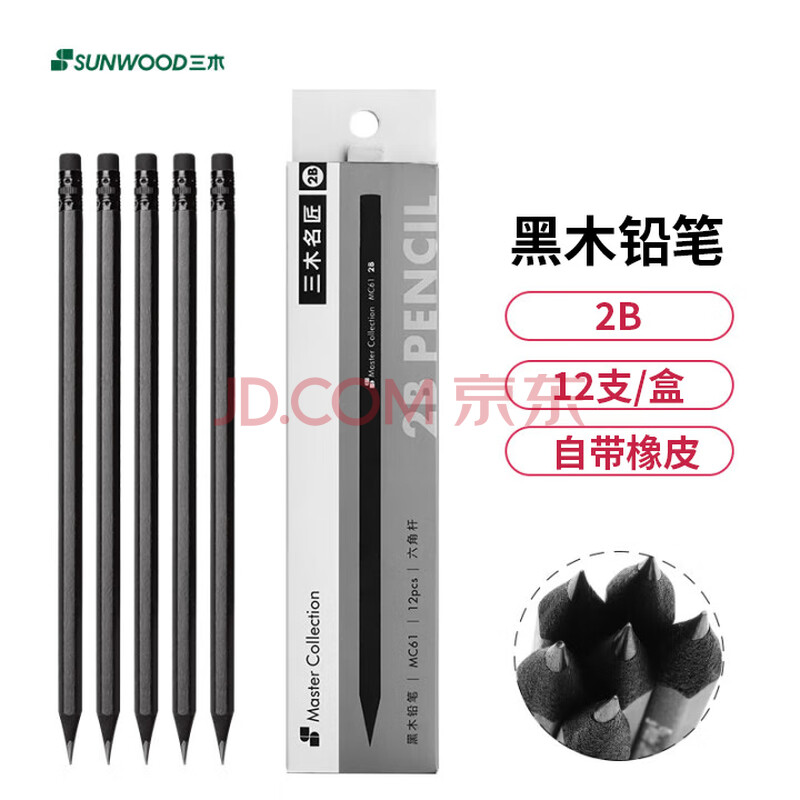 商品相册:三木(SUNWOOD) 名匠系列 12支2B六角杆黑木铅笔/考试涂卡/绘图/书写笔 MC61第