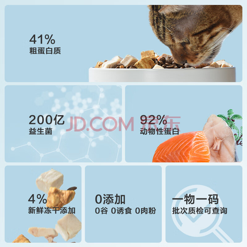 商品相册:京东京造 冻干双拼全价猫粮鱼肉味2kg 高鲜肉营养美毛发腮成幼猫益生菌第