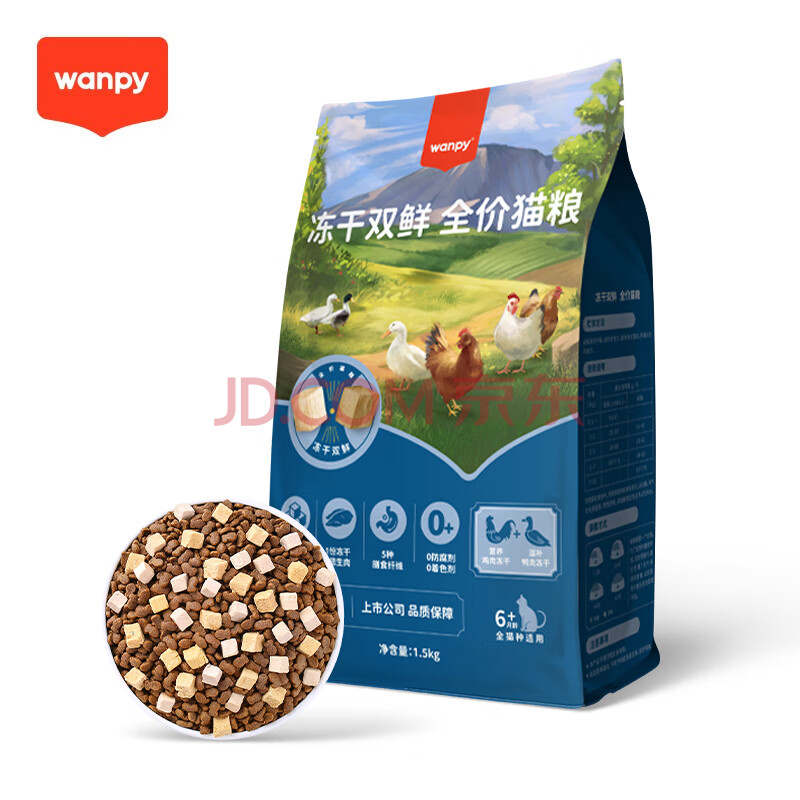 商品相册:顽皮(Wanpy)双鲜猫粮 添加冻干鸡肉&鸭肉双拼猫粮1.5kg 成猫天然粮第