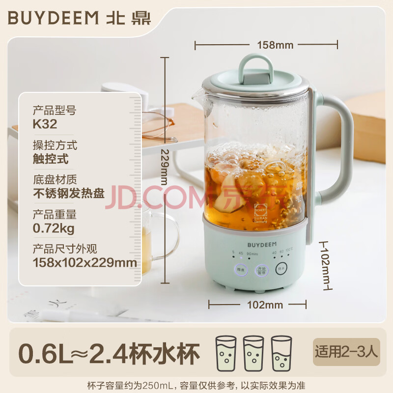 商品相册:北鼎(Buydeem)【无胶水】养生壶电水壶迷你养生杯办公室保温电热水壶煮茶器K32浅杉绿(不含萃取篮)第