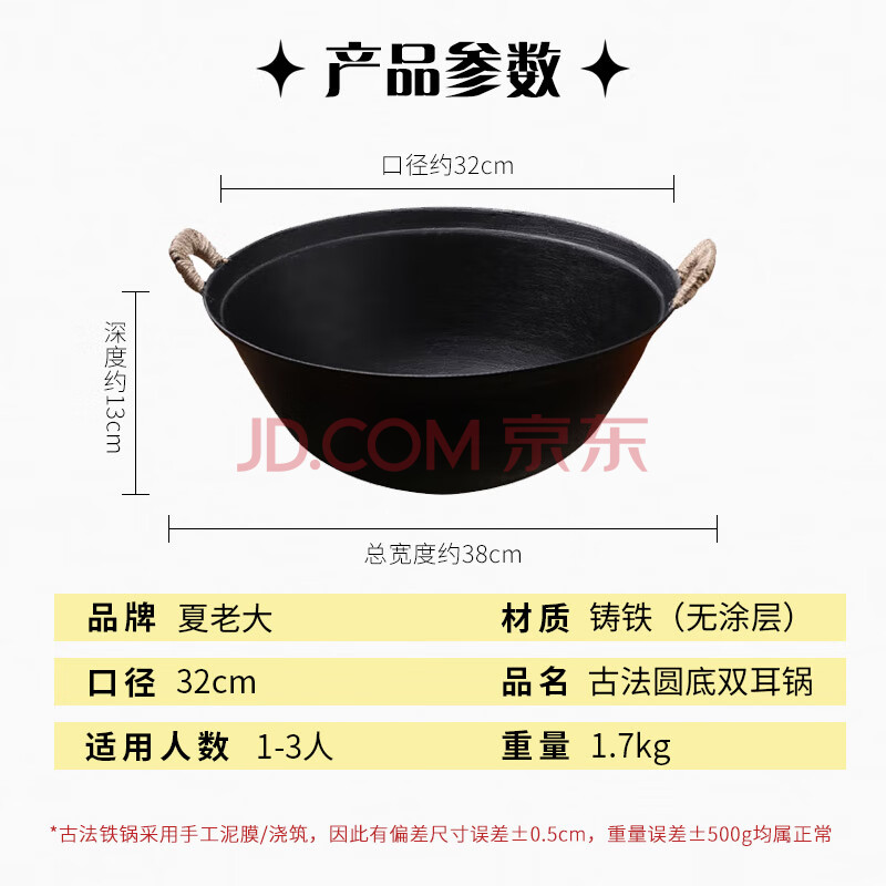 商品相册:夏老大古法生铁锅双耳锅铸铁炒锅无涂层老式传统不易粘炖锅圆底炒菜锅32第