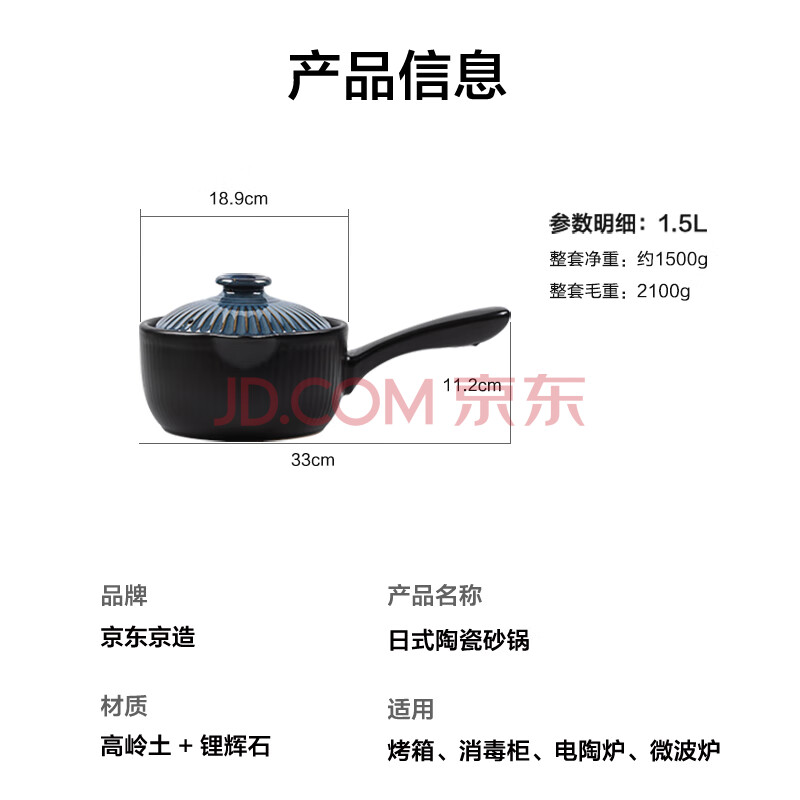 商品相册:京东京造 砂锅 汤锅 日式陶瓷炖煮煲汤锅熬药煎药壶 燃气灶通用单柄1.5L第