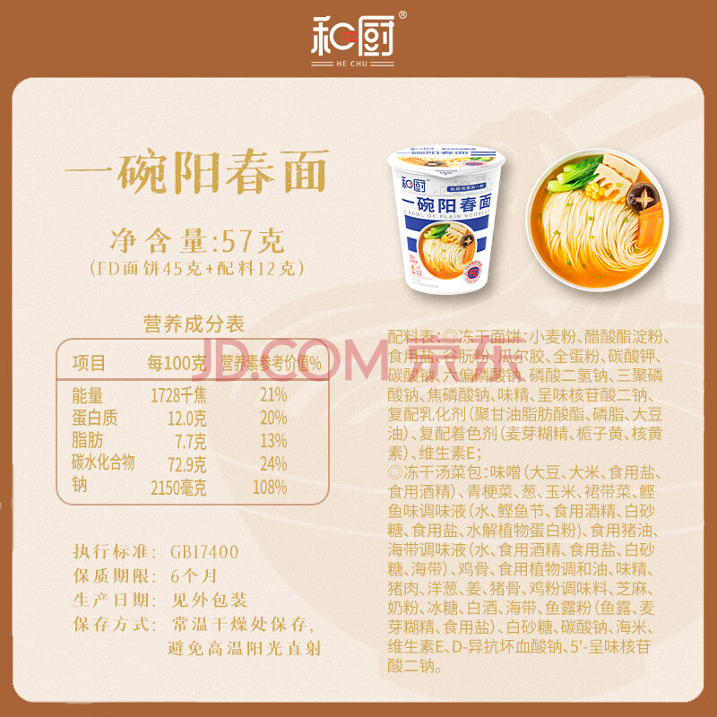 商品相册:和厨方便面泡面FD冻干面一碗阳春面拉面57g*6桶新旧包装随机发货第