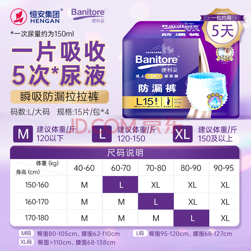 商品相册:便利妥(Banitore)瞬吸防漏拉拉裤 L码60片(95-120cm)老年人尿不湿成人纸尿裤拉拉裤第