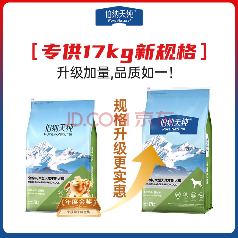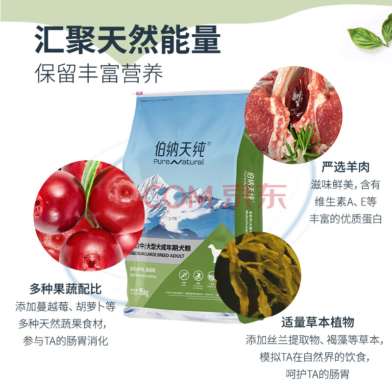 商品相册:伯纳天纯中大型犬全价成年犬粮金毛宠物主粮羊肉蔓越莓15kg/30斤第