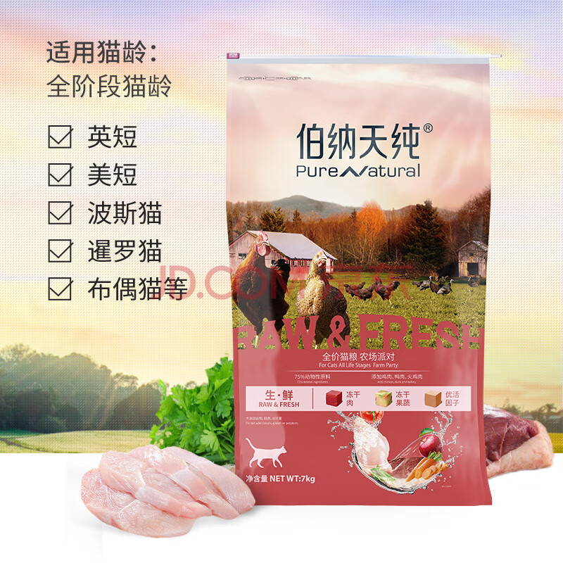 商品相册:伯纳天纯生鲜系列冻干全价通用猫粮农场派对(鸡肉鸭肉)7kg/14斤第