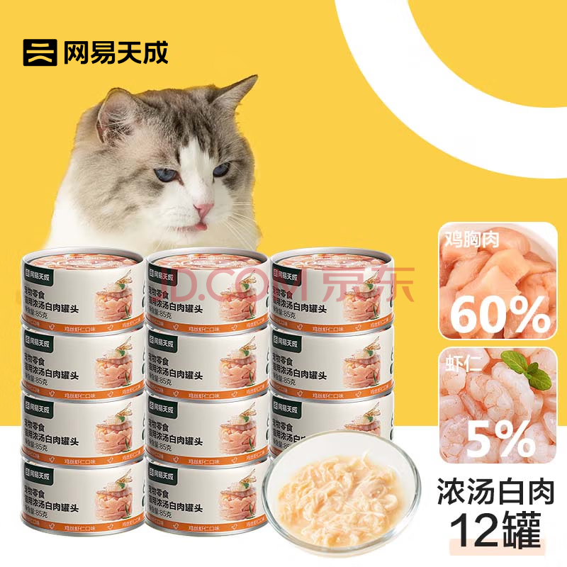 商品相册:网易严选猫罐头猫湿粮宠物零食猫用浓汤白肉罐头鸡丝虾仁口味85克*12罐第