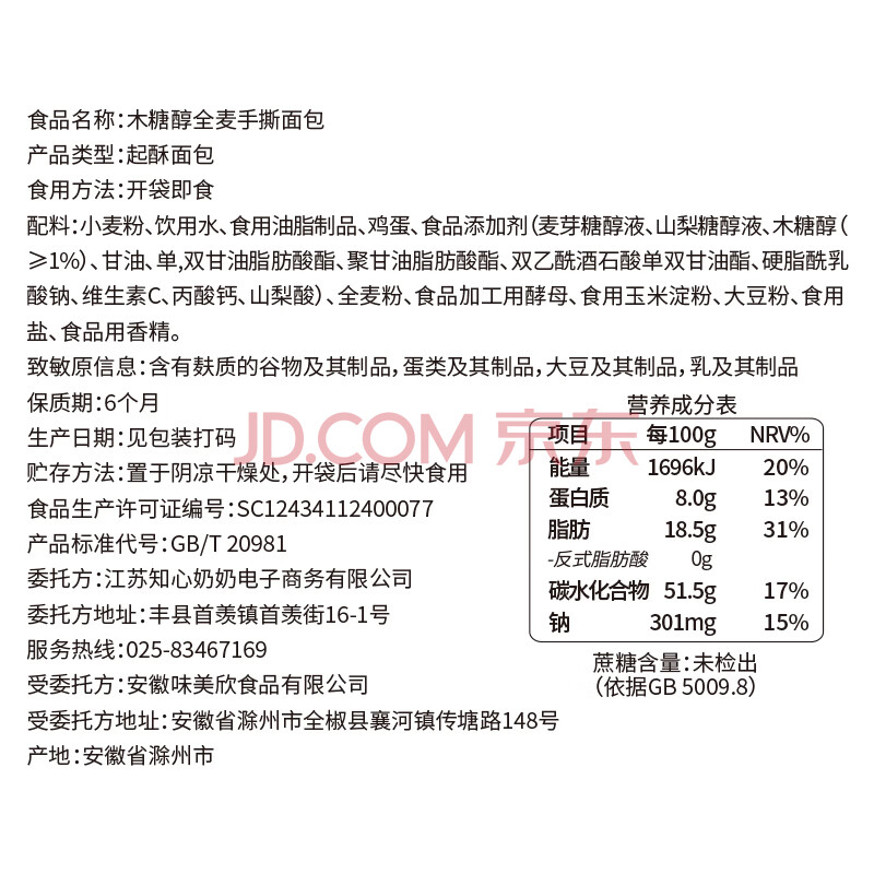 商品相册:知心奶奶木糖醇手撕全麦面包粗杂粮无糖精老年人代早餐糕点零食食品650g第