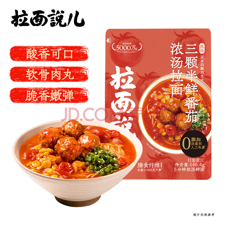 商品相册:拉面说儿浓汤三颗半番茄拉面 速食方便食品料理包 袋装方便面146.4g/袋 第