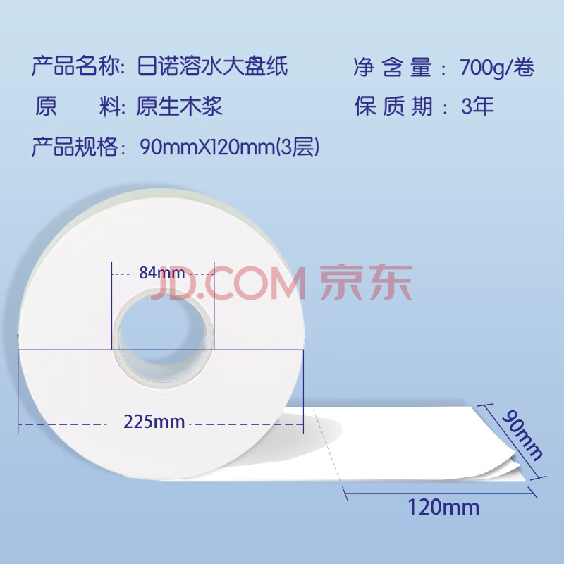 商品相册:日诺(Rinuo)水溶大卷纸溶水厕纸酒店专用大盘纸商用速溶3层700克 1箱12卷第
