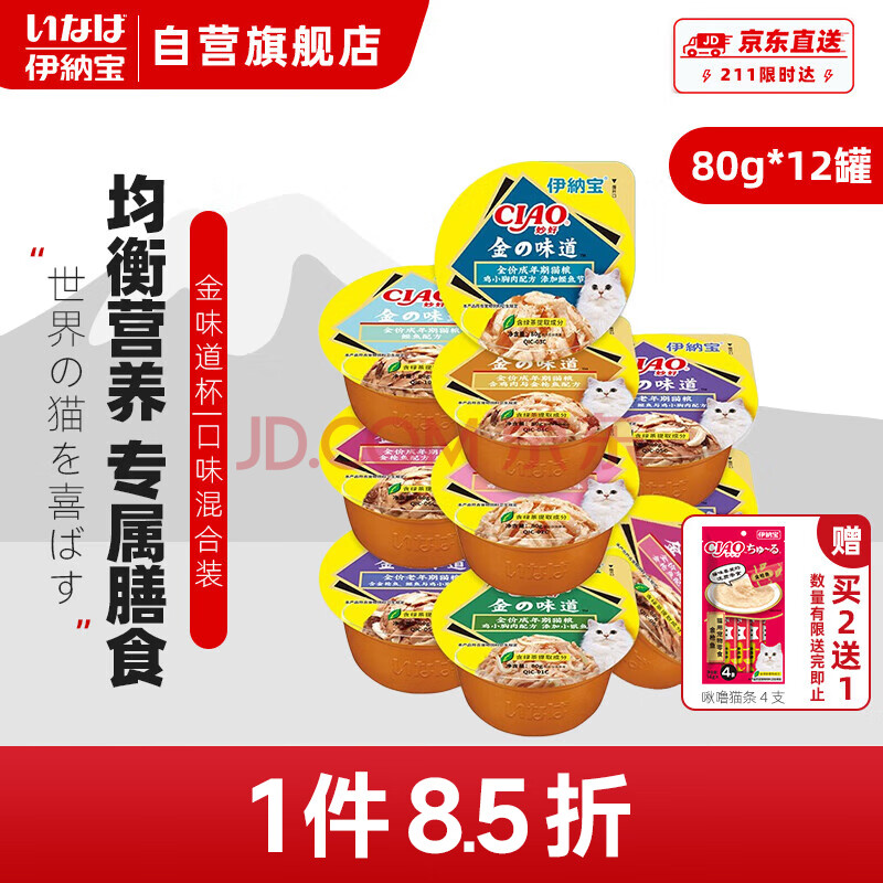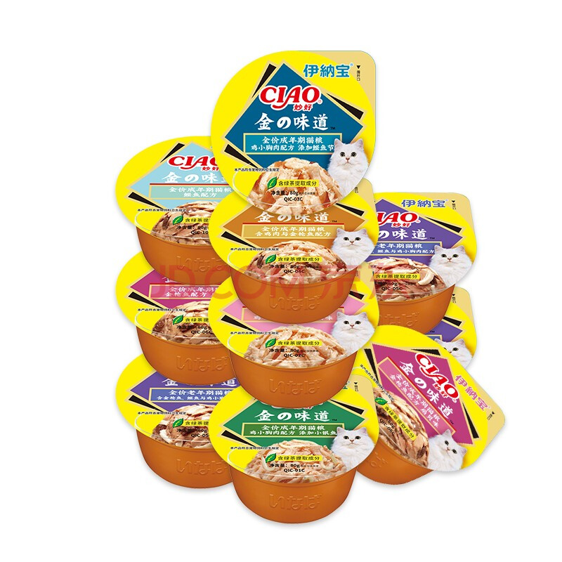 商品相册:伊纳宝金味道杯宠物猫鸡肉猫罐头混合口味80g*12罐第