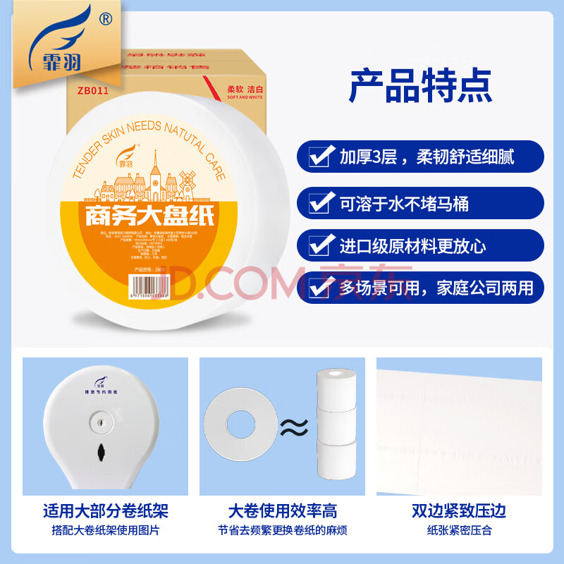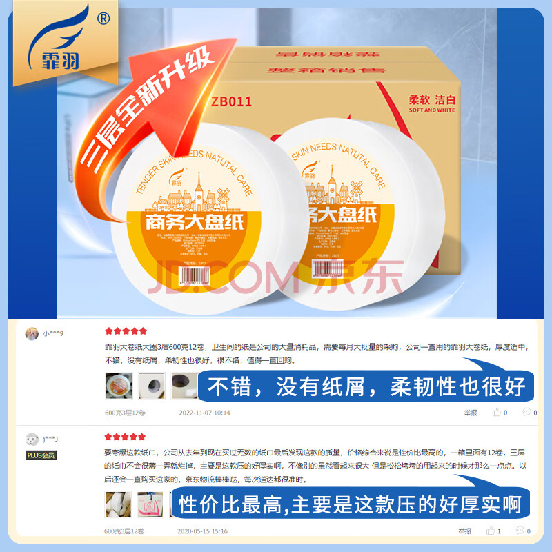 商品相册:霏羽有芯大卷纸3层600克*12卷商用大盘纸卷筒酒店卫生纸整箱销售ZB011第