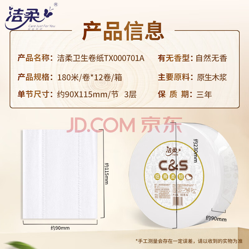 商品相册:洁柔有芯大卷纸3层180米*12卷大盘纸商用卫生纸卷筒纸整箱TX000701A第