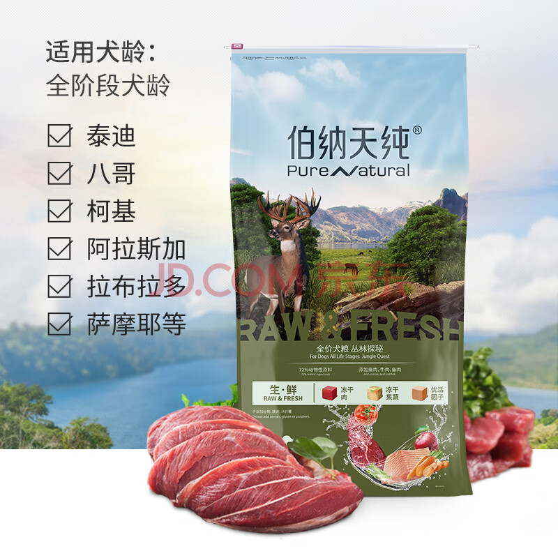 商品相册:伯纳天纯狗粮小型犬中大型犬幼犬成犬全价通用粮四拼冻干鹿肉味10kg/20斤第