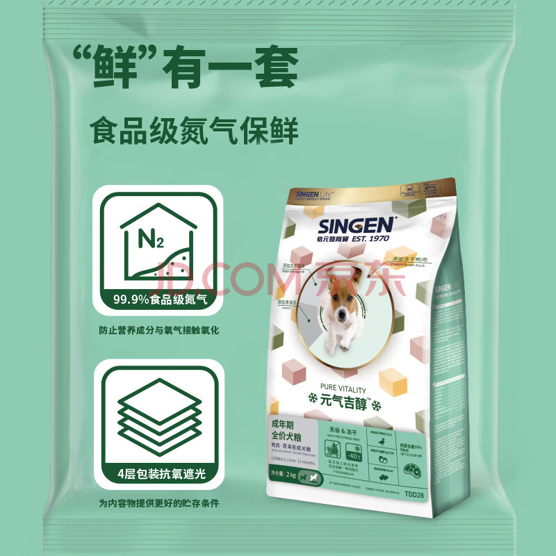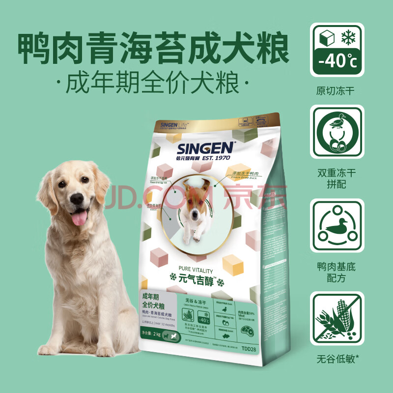 商品相册:信元发育宝(SINGEN)元气吉醇鸭肉青海苔全价成犬2kg挑食小狗科学养宠通用冻干狗粮第