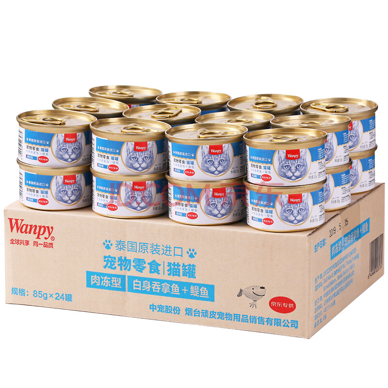 商品相册:顽皮(Wanpy)泰国进口 猫罐头85g*24罐 白身吞拿鱼+鳀鱼罐头(肉冻型) 成猫零食第