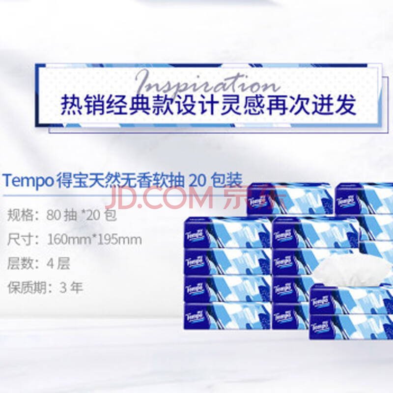 商品相册:得宝(TEMPO)抽纸 无香4层80抽*20包 湿水不易破 卫生纸 纸巾(整箱销售)第