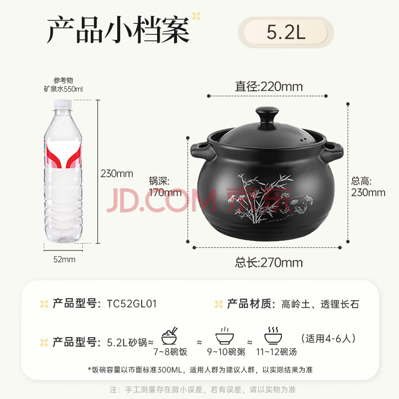 商品相册:炊大皇 陶瓷煲 5.2L砂锅煲汤熬药煮粥焖饭炖锅 养生汤锅大肚煲明火使用第