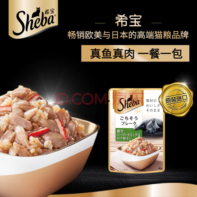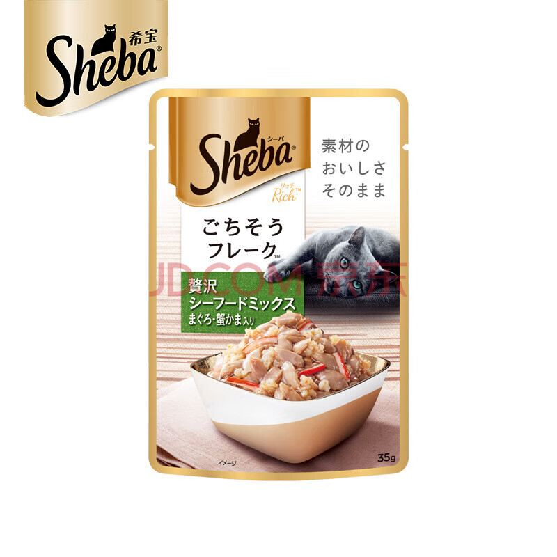 商品相册:希宝原装进口肉块软包吞拿鱼虾及蟹柳棒成猫35g*12整盒装白金妙鲜包第
