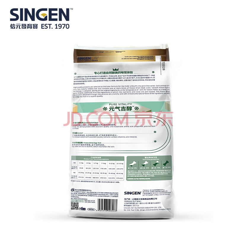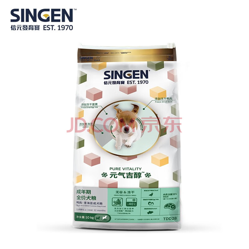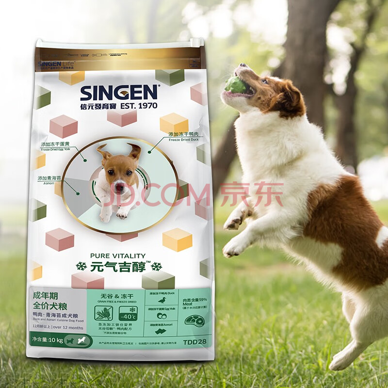 商品相册:信元发育宝(SINGEN)元气吉醇鸭肉青海苔成犬粮10kg 低敏无谷冻干两拼大袋狗粮20斤第