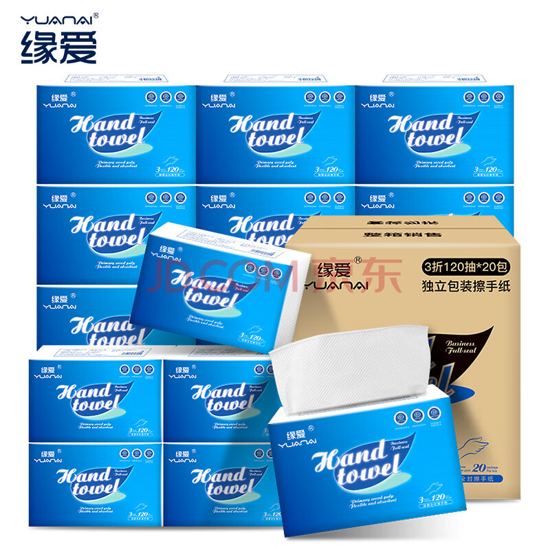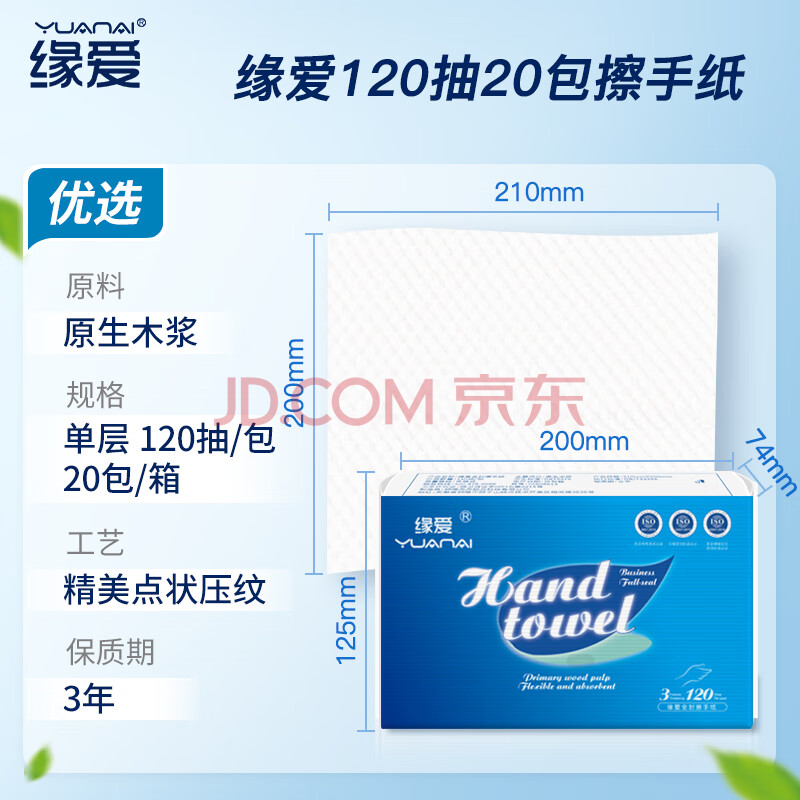 商品相册:缘爱商用擦手纸单层120抽*20包 加厚强韧吸水吸油干手抹手纸抽纸 整箱第