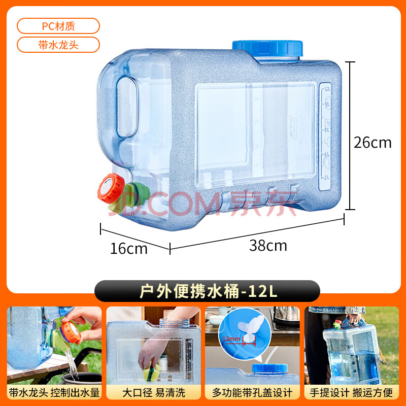 商品相册:尚烤佳(Suncojia)纯净水桶家用储水桶户外饮用水桶广口水桶车载水桶带水龙头12L第1张/共9