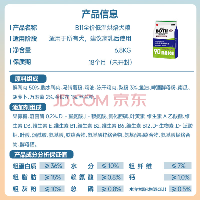 商品相册:BOTH 鸭肉梨 烘焙狗粮清火 中小型犬比熊泰迪柯基 成幼犬粮6.8kg第