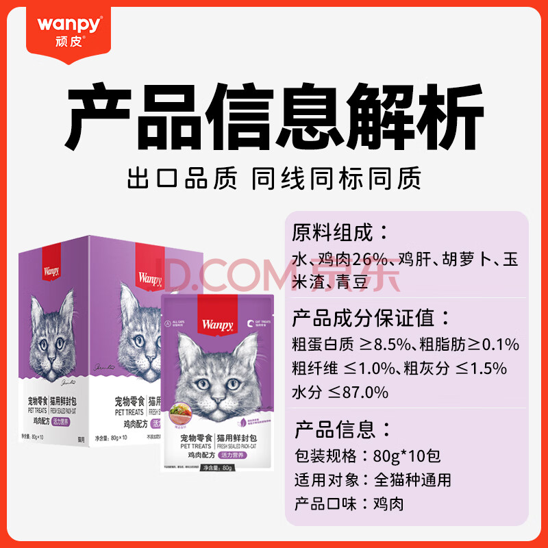 商品相册:顽皮(Wanpy)猫零食鸡肉鲜封包800g(80g*10包)猫湿粮成幼猫咪宠物零食第