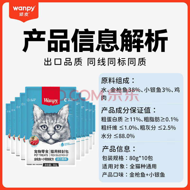 商品相册:顽皮(Wanpy)猫零食金枪鱼小银鱼鲜封包800g(80g*10包)猫粮湿粮第
