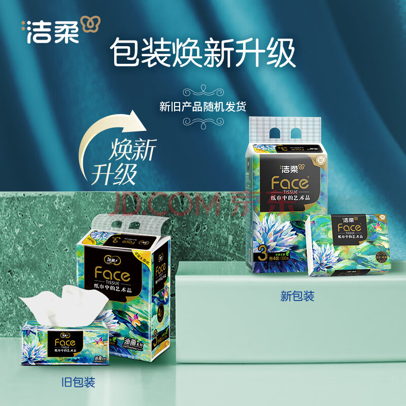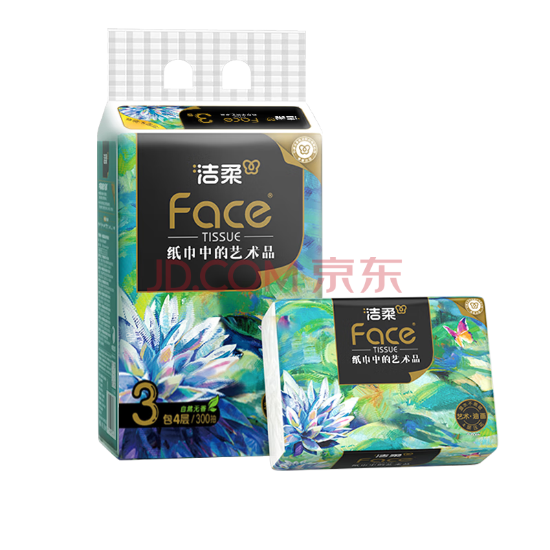 商品相册:洁柔抽纸 艺术油画Face4层100抽*3包 可湿水面巾纸湿水柔韧 亲肤细腻第